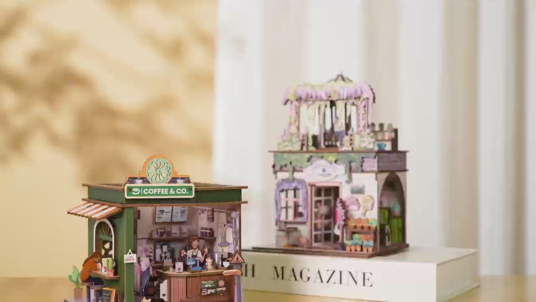Nestled along a quiet lane, Little Village Bookstore captures the charm of a cozy countryside bookstore. This DIY wooden miniature features arched windows, shelves filled with tiny books, and a storybook roof shaped like an open page. Soft LED lighting brings the scene to life, creating a warm, inviting glow once complete.